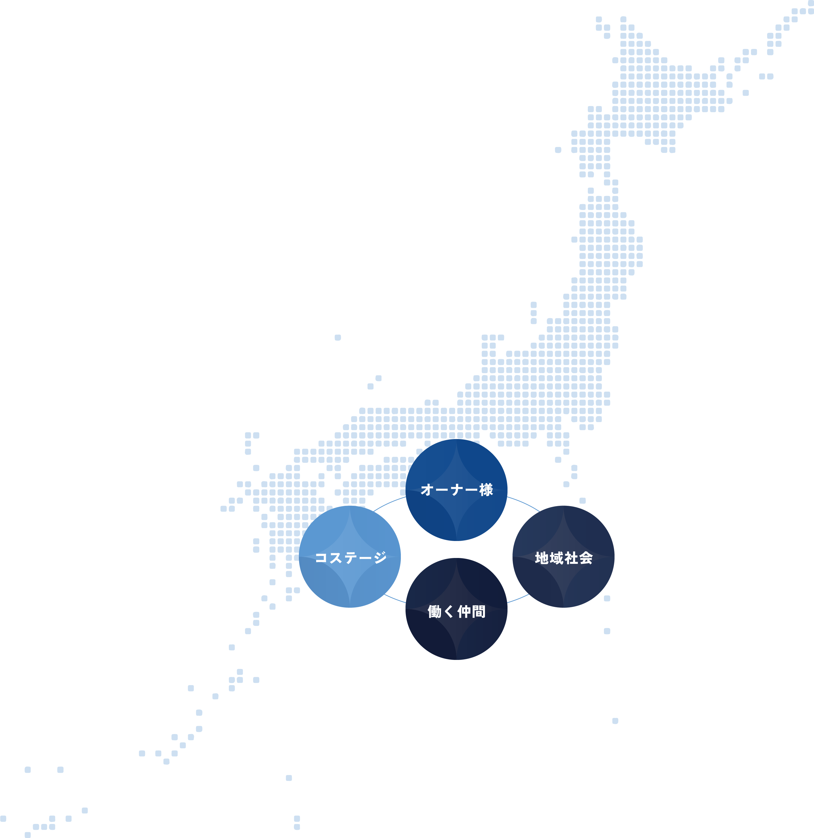 私たちは現場の最前線に立ち続け、豊富な経験から得られる情報と、⾧年かけて築き上げてきた人との温かいつながり、それら全てを武器にして、オーナー様と働く仲間が抱える課題に取り組みます。