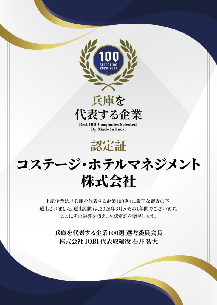このたび、株式会社IOBI様が運営する「Made In Local」にて、「兵庫を代表する企業100選(2026年度)」に認定いただきました。弊社が掲げる「また来たいの想いを、カタチにする」=「お客様の心に”また来たい”という思いを灯すことで、”一度目の偶然”から二度、三度の”再訪”を促す」というミッションが、「宿泊業を通じた地域貢献の実現」につながるとの評価を頂戴いたしました。
